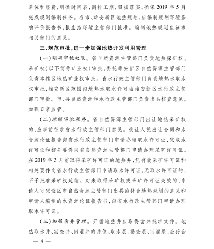 河北省地热资源丰富,约80%的平原地区赋存地热资源。近年来,各地把地热作为替代能源之一,不断加大投资开发力度,全省地热井数量骤增,一些地方出现了不同程度的开发利用无序无度问题。为促进地热资源有效保护与合理开发,河北省明确,开发利用地热,必须进行环境影响评价,将取水许可作为办理采矿许可的前置条件。由省自然资源主管部门负责地热探矿权、采矿权审批,省水行政主管部门负责地热水取水权审批,市、县自然资源和水行政主管部门负责出具核查意见。凿井施工等单位不得承揽未取得省水行政主管部门批准文件的地热取水井、勘查井、回灌井工程。新上的供暖类地热开发利用项目,由设区市自然资源主管部门组织论证并出具论证意见,不具备回灌条件和具备回灌条件不实施同层回灌的,不予批准。