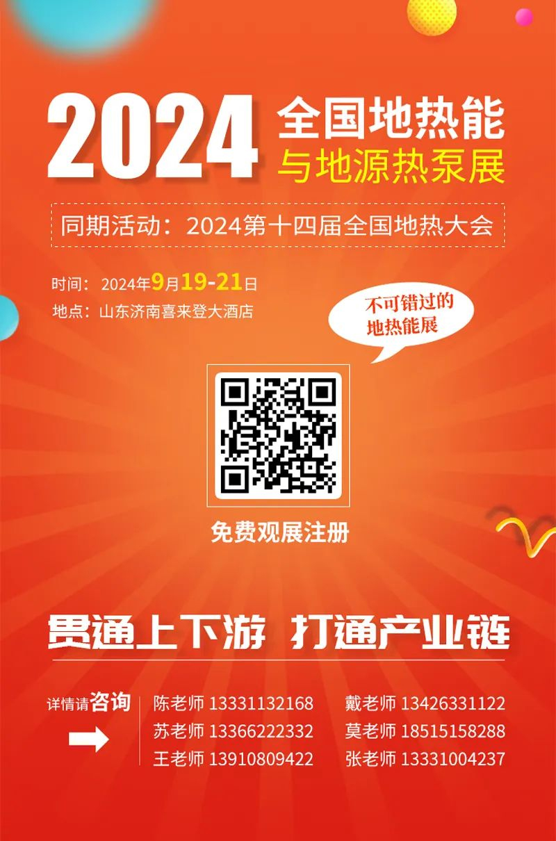 大力开发利用地热能,对深入贯彻习近平生态文明思想,落实碳达峰、碳中和目标具有重要意义。由中国技术监督情报协会地热产业工作委员会、中国地质调查局浅层地温能研究与推广中心、北京中航环宇新能源研究院、自然资源部浅层地热能重点实验室、自然资源部深部地热资源重点实验室共同主办的“2024第十四届全国地热大会”将于2024年9月19—21日在山东济南召开,大会同期将举办2024全国地热能与地源热泵展览会,汇聚全国地热能行业的生产厂家、系统集成商、配套服务商以及产业链上下游企业,全面展示我国地热产业发展成就,推荐新产品、新技术、新服务、新成果,搭建广阔的交流合作平台,共促地热产业高质量发展。展会期间,组委会将邀请有关专家、相关政府领导巡展,同期将推出一系列配套活动。在此,大会组委会诚挚邀请贵单位组织相关人员免费参观2024全国地热能与地源热泵展览会。现将有关事宜通知如下: