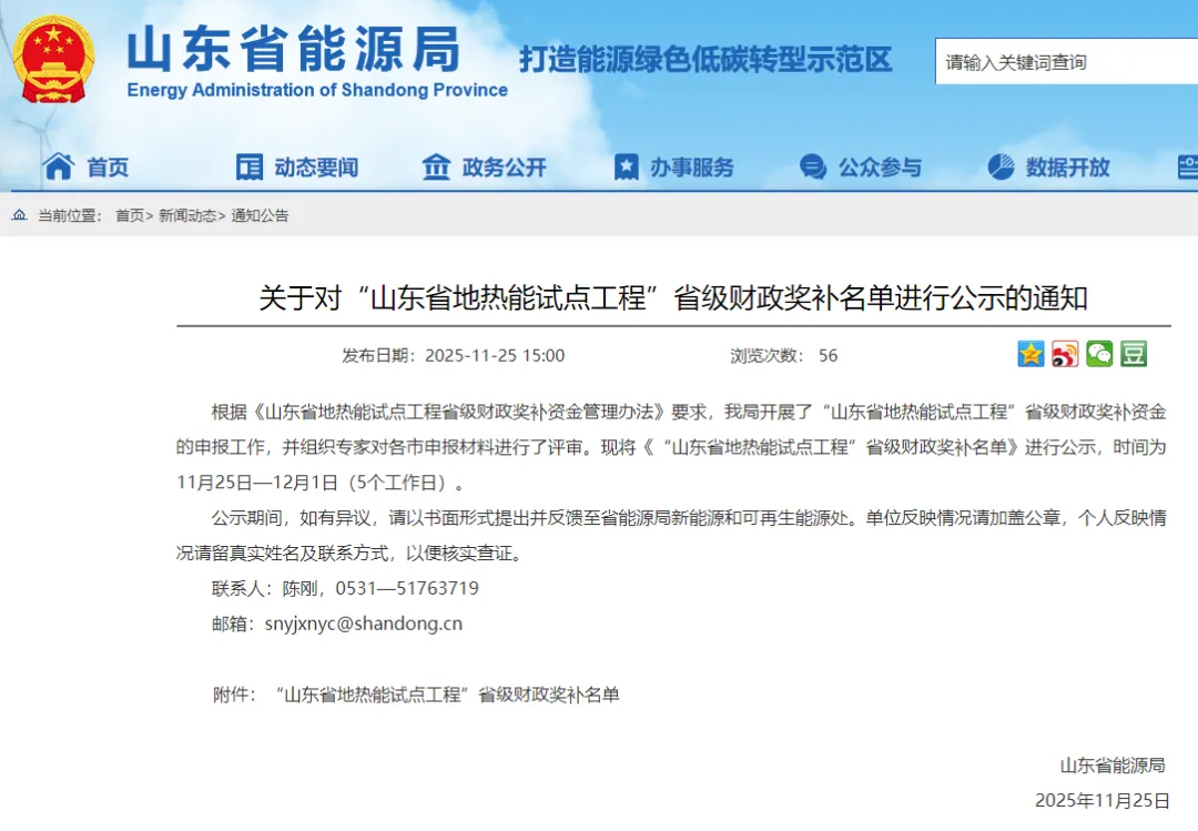 11月25日,山东省能源局对入选省级财政奖补名单的“山东省地热能试点工程”进行公示。位于徐州路的“地热能+”多能互补综合利用项目成功入选,该项目共建有10口开采井,公示期从11月25日起至12月1日止。