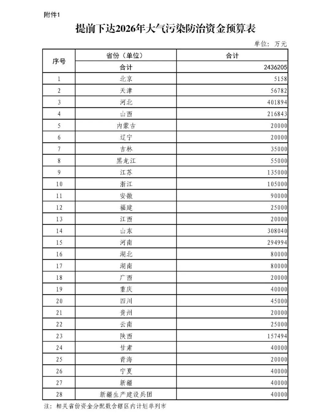 为支持大气污染防治工作,促进大气质量改善,现下达你省(自治区、直辖市、新疆生产建设兵团,以下统称省)2026年大气污染防治资金,用于支持开展减污降碳等方面相关工作,并就有关事项通知如下: