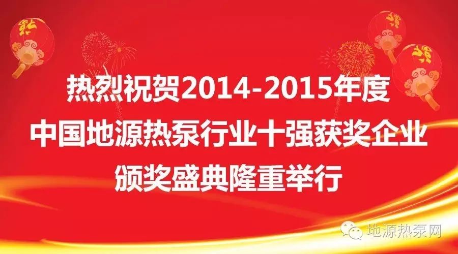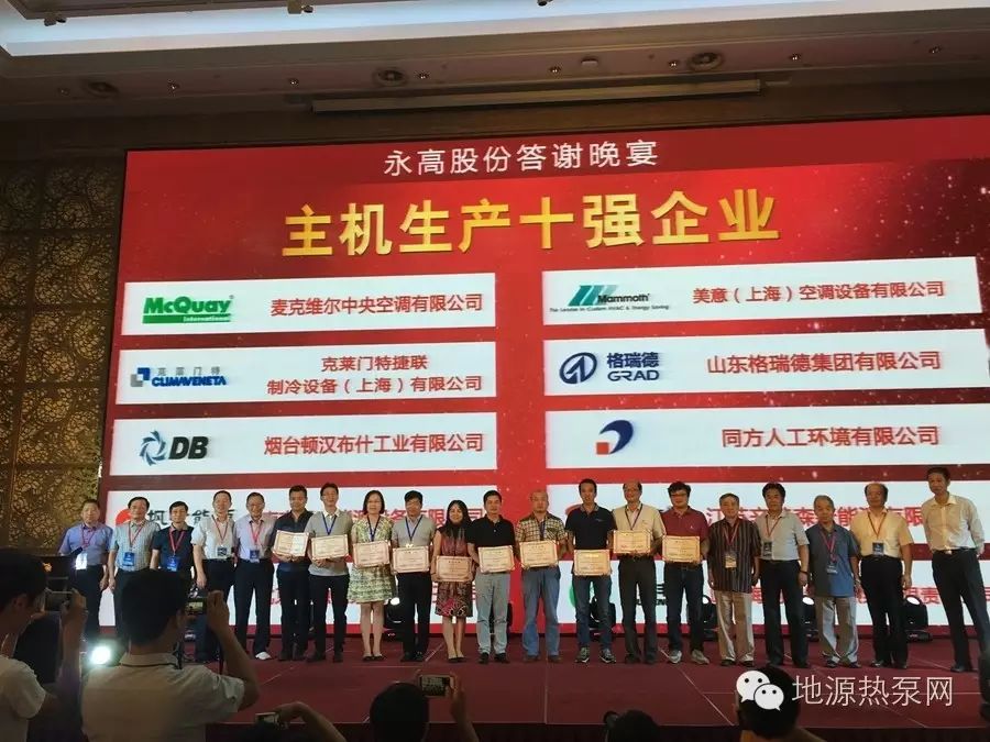 荣获2014-2015年度地源热泵主机生产十强企业包括:麦克维尔中央空调有限公司、克莱门特捷联制冷设备(上海)有限公司、烟台顿汉布什工业有限公司、南京枫叶能源设备有限公司、北京永源热泵有限责任公司、山东格瑞德集团有限公司、美意(上海)空调设备有限公司、山东海利丰地源热泵有限责任公司、同方人工环境有限公司、江苏辛普森新能源有限公司。