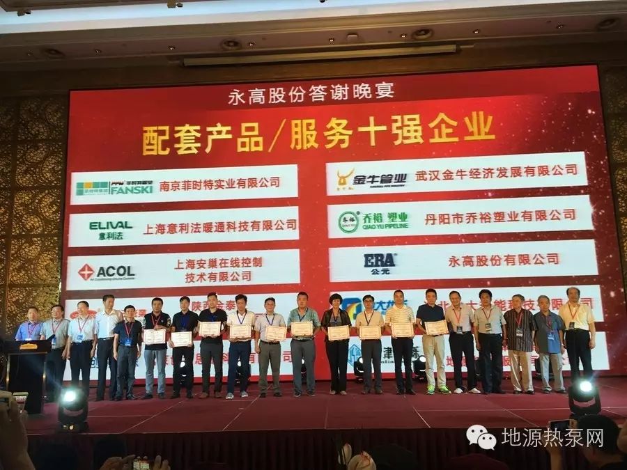 荣获2014-2015年度地源热泵配套产品/服务十强企业:南京菲时特实业有限公司、 武汉金牛经济发展有限公司、永高股份有限公司、上海意利法暖通科技有限公司、上海安巢在线控制技术有限公司、陕西金泰王管业科技有限公司、北京创利思源科贸有限公司、天津锦铄地源技术服务有限公司、湖北地大热能科技有限公司、丹阳市乔裕塑业有限公司。