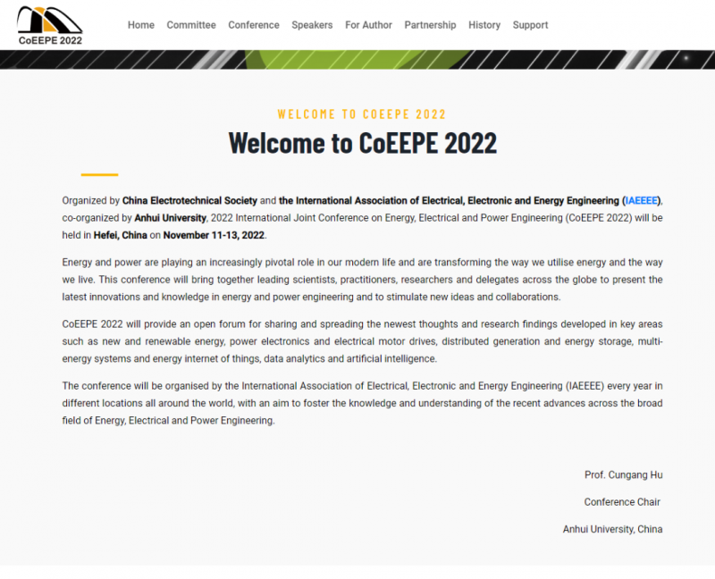 由国际电气、电子和能源工程协会(以下简称:IAEEEE)和中国电工技术学会主办,安徽大学、山东大学和中科院海西研究院承办的2022年能源,电力与电气工程国际会议(以下简称:CoEEPE2022)已定档2022年11月11-13日,在安徽合肥滨湖国际会展中心,将与2022PETE电力展同期同地举办。会议论文集EI收录,优秀论文推荐到多个SCI和EI国际期刊发表。