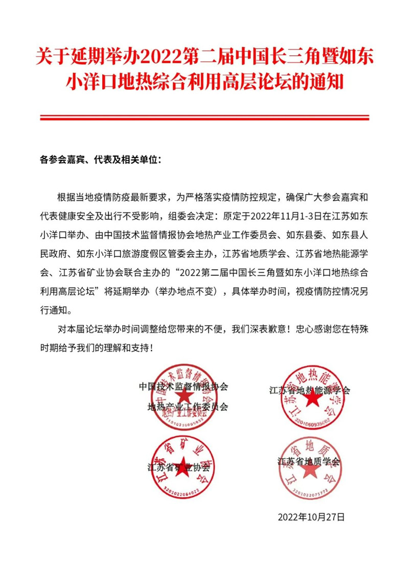 因疫情防控需要,原定于2022年11月1-3日在江苏如东小洋口举办的“2022第二届中国长三角暨如东小洋口地热综合利用高层论坛”,将延期举办,具体举办时间视疫情防控情况另行通知。