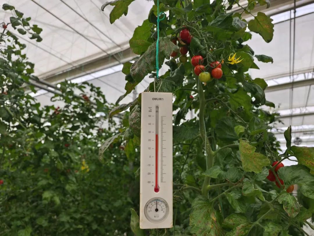 参观考察期间,考察团一行还来到了黄河三角洲设施农业测试验证平台,大棚里温暖如夏,绿油油的叶子中间,一颗颗红彤彤的西红柿点缀其中,工人们正忙碌着将一串串成熟的西红柿剪下、装箱。当日,温室大棚内的温度计显示27度。大棚内的温度正是通过水的循环,将地热尾水中的热量提取出来,传导到大棚内。