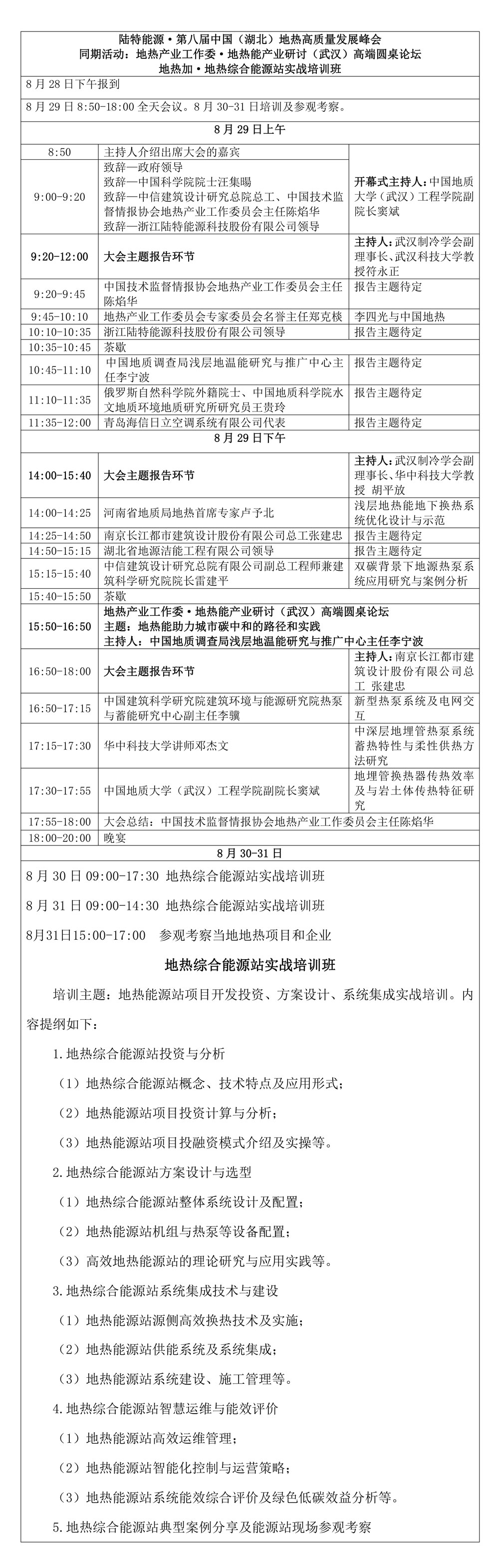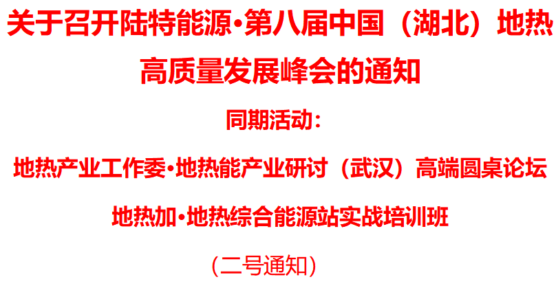 为贯彻党的二十大精神,落实“双碳”战略,创新服务夏热冬冷地区地热能高质量发展,形成可复制、可借鉴、可推广的经验,由中国技术监督情报协会地热产业工作委员会、北京中航环宇新能源研究院、地热加研习社、地热加APP在连续成功举办七届中国地热高质量发展峰会的基础上,拟定于8月29-31日在武汉召开陆特能源·第八届中国(湖北)地热高质量发展峰会,同期召开地热产业工作委·地热能产业研讨(武汉)高端圆桌论坛和举办地热加·地热综合能源站实战培训班。现将有关事项通知如下。