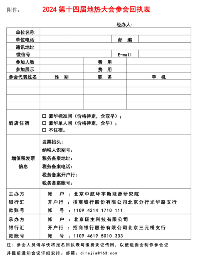 为全面深入推进地热产业高质量发展,有力促进地热产业做大做优做强,中国技术监督情报协会地热产业工作委员会、中国地质调查局浅层地温能研究与推广中心、北京中航环宇新能源研究院、自然资源部浅层地热能重点实验室、自然资源部深部地热资源重点实验室,拟定于2024年9月下旬联合召开“2024年地热大会”,地热大会(原名:中国国际地热高层论坛)迄今已成功举办了13届。该论坛是我国地热行业连续举办时间最长、参会人数最多、覆盖面最广、影响力最大的专业性行业盛会。