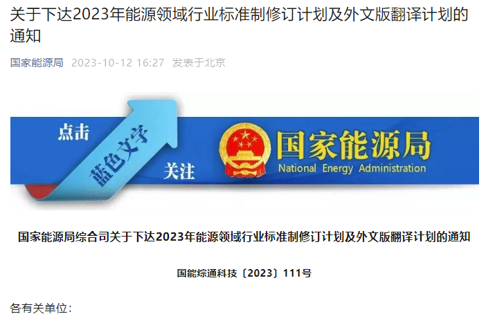 10月12日,国家能源局微信公众号发布了《关于下达2023年能源领域行业标准制修订计划及外文版翻译计划的通知》,2023年能源领域行业标准制定计划665项、标准修订计划455项及外文版翻译计划64项。