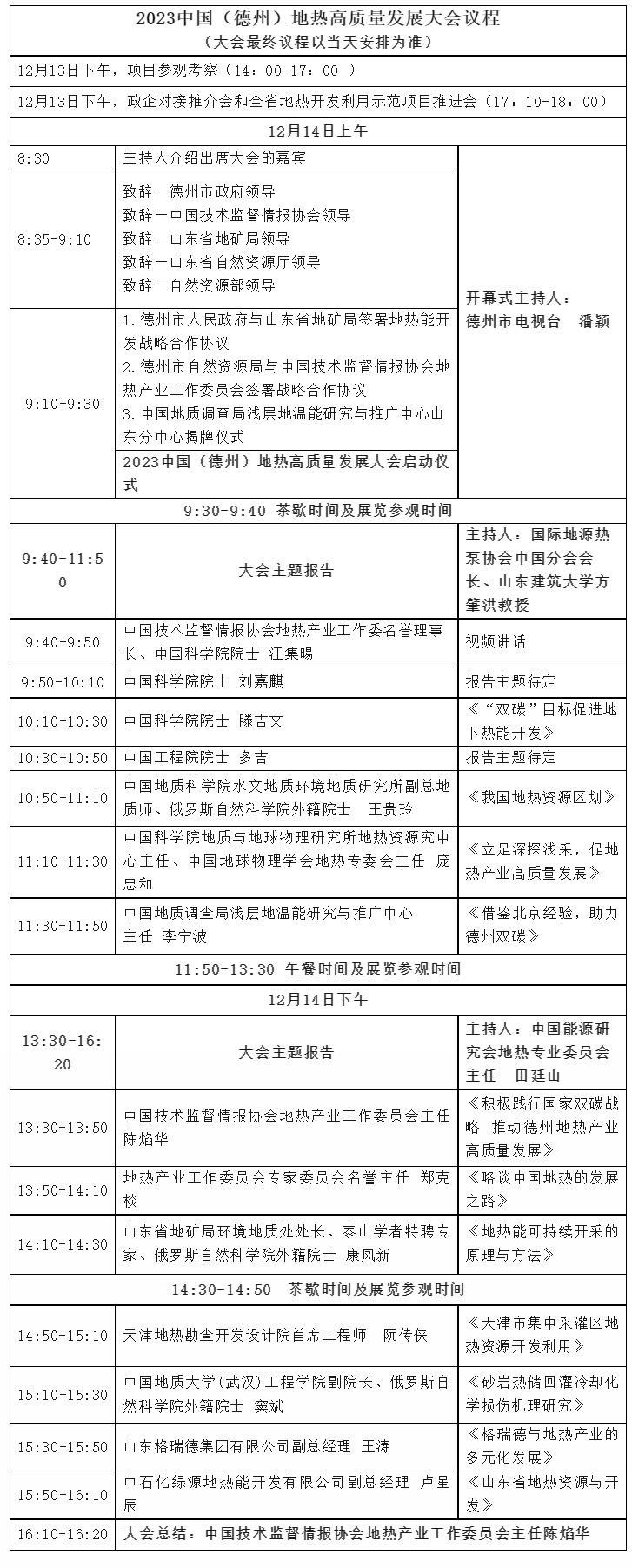 为贯彻习近平生态文明思想,认真落实山东省委、省政府部署要求,全力实施《德州市矿产资源总体规划(2021—2025年)》,更好发挥德州市地热资源优势,坚持在开发中保护、在保护中开发,着力打造地热能开发利用“德州模式”,力争把地热产业培育成为德州市经济发展新的增长点,服务黄河流域生态保护和高质量发展,德州市人民政府、山东省地质矿产勘查开发局、中国技术监督情报协会地热产业工作委员会拟定于2023年12月13-14日共同举办“2023中国(德州)地热高质量发展大会暨地热装备(技术)展会”。现将相关事宜通知如下: