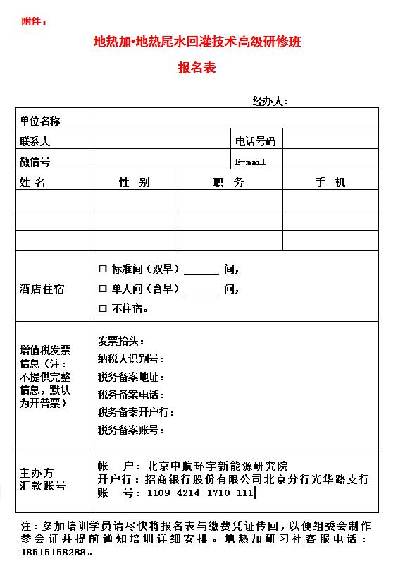 为满足广大地热能和水源热泵从业者更系统、更全面、更完整的掌握地热尾水高效回灌技术,进一步提升专业能力和综合素质,持续增强地热企业核心竞争力,地热加研习社联合北京中航环宇新能源研究院拟于5月17-18日在北京举办地热加•地热尾水回灌技术高级研修班。现将培训有关事项通知如下: