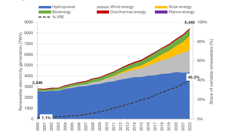 从2010年到2022年,可再生电力的增长主要是由太阳能和风能驱动的。这两种能源被归类为可变可再生能源,占2022年全球发电组合的11.7%,自2021年以来增长18.2%。2022年,风能和太阳能分别贡献了2098太瓦时和1294太瓦时的发电量。