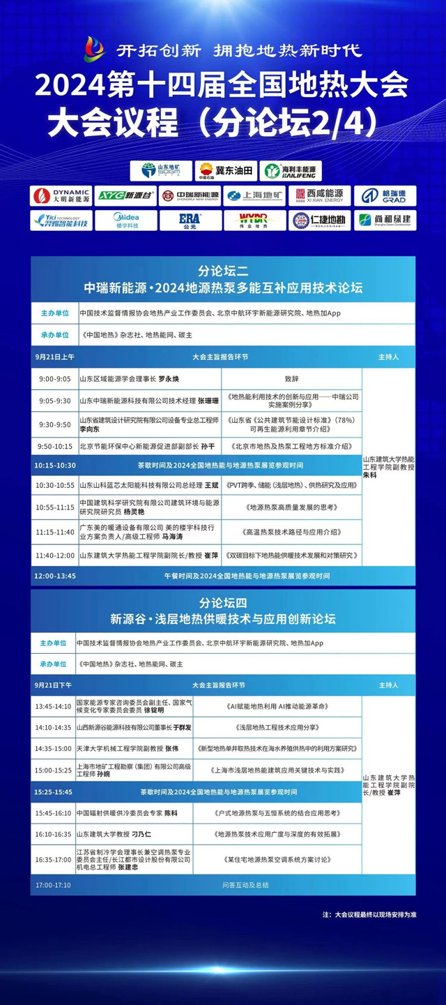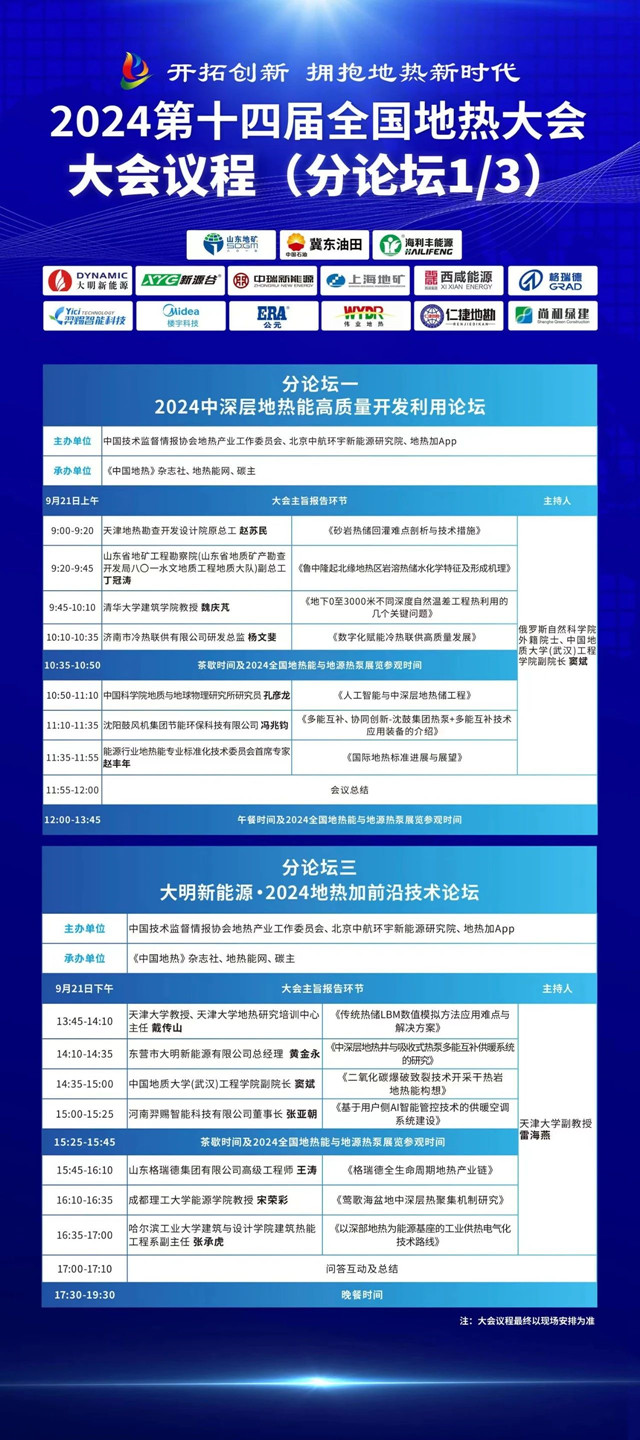 地热领域权威专家、政府有关部门领导,行业协会组织、地热企业、科研院所、高等院校、节能投资及碳中和产业服务企业,媒体记者等出席了2024第十四全国地热大会和参观了全国地热能与地源热泵展。9月20日召开的大会还通过“地热加”微信视频号对大会进行了全程直播。本次大会主办方设置了开幕式、主论坛、平行分论坛、项目对接洽谈、授牌颁奖仪式、项目参观考察、2024全国地热能与地源热泵展等活动。在为期两天的会议中,50多位院士专家、行业大咖、高层领导作专题报告,为我国地热产业高质量发展把脉会诊,聚焦地热产业高质量发展新趋势、探索地热能高效利用新路径,提出更多创新性、开拓性的意见建议。我国地热资源丰富,资源量约占全球地热资源的六分之一,开发利用潜力巨大。地热是一种可再生能源,具有资源量大、能源利用效率高、节能减排效果好等诸多优点,在能源变革背景下具有独特的“先发优势”。发展地热产业不仅对于调整能源结构、节能减排、改善环境具有重要意义,而且对于国家培育新兴产业、带动相关装备制造国产化和工程技术业务发展具有明显的带动效应,是建设生态文明、实现绿色发展的重要举措。大会聚焦地热领域发展热点趋势,分享地热能开发科技和创新成果,共商地热产业高质量发展未来。山东省自然资源厅党组成员、副厅长闫金明致开幕词,中国科学院院士、中国地热产业工作委名誉理事长汪集暘作视频致辞。自然资源部矿产资源保护监督司原司长、研究员、中国矿业权评估师协会负责人鞠建华,中国技术监督情报协会副会长李功成,中国技术监督情报协会地热产业工作委员会主任陈焰华,山东省地质矿产勘查开发局党委常委、副局长刘祥元,中国石油冀东油田公司总经理、党委副书记何东博,山东省土木建筑学会暖通空调专业委员会秘书长、山东省建筑设计研究院有限公司设备专业总工程师李向东出席大会并致辞。开幕式由中国地质调查局浅层地温能研究与推广中心主任李宁波主持。