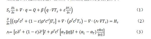 本次数值模拟软件采用Feflow软件,地埋管换热器采用一维有限元法进行刻画,周围的岩土体采用三维有限元的处理方法。热量传输主要包括岩土体中热量传输和井孔热量传输。岩土体中热量传输控制方程为如下: