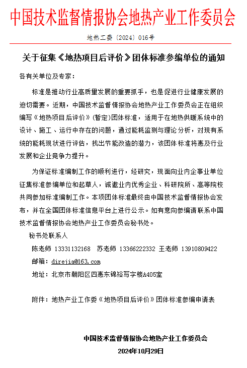 为保证标准编制工作的顺利进行,经研究,现面向业内企事业单位征集标准参编单位和起草人,诚邀业内优秀企业、科研院所、高等院校共同参加标准编制工作。本项团体标准最终由中国技术监督情报协会发布,并在全国团体标准信息平台上进行公示。如有意向参编请联系中国技术监督情报协会地热产业工作委员会秘书处。