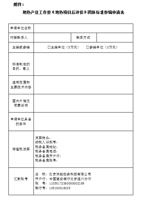 附件:地热产业工作委《地热项目后评价》团体标准参编申请表