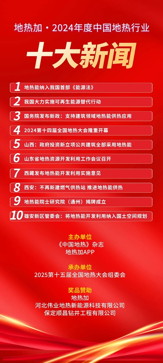 导语:为宣传展示2024年我国地热能行业发展成就,进一步弘扬主旋律、传播好声音、扩大影响力,《中国地热》杂志、地热加APP组织开展了“2024年度中国地热行业十大新闻评选活动”,经前期筛选、网络投票和专家综合评议,遴选出了2024年我国地热能行业十大新闻。借此以窥过去一年地热行业的发展成就,铭记这一年的奋进与不易,激励我们在新的一年顺势而为、乘势而上,踏上新征程,再创新辉煌。