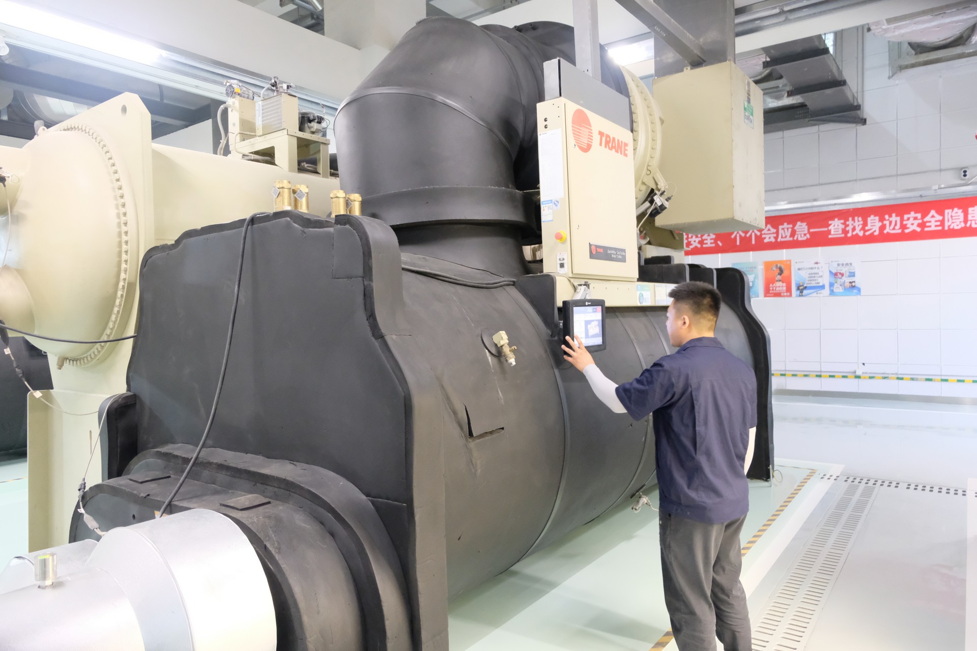 据现场工作人员介绍,“三大建筑”采用地源热泵+水蓄能+燃气锅炉+冷水机组供能系统,其中地源热泵装机按照热负荷60%配置,实际运行中地源热泵供给可占冬季供热总量的80%以上。绿心公园其他配套建筑项目采用地源热泵+水蓄冷供能,分散设置7座能源站。该项目能源站巧妙利用原有建筑消防水池作为水蓄能系统调峰,结合各站点周围绿化条件,设置室外地埋换热系统。地源热泵结合建筑屋顶光伏388kW及绿电供应,实现可再生能源全覆盖供应。同时还搭建能源智慧管理平台,实现智能化、集约化管理。
