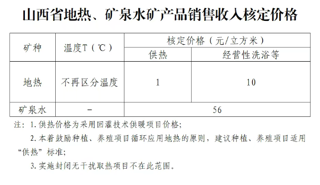 根据要求,山西省地热矿产品销售收入核定价格不再区分温度,地热用于供热的核定价格为1元/立方米,经营性洗浴等核定价格为10元/立方米。供热价格为采用回灌技术供暖项目价格,实施封闭无干扰取热项目不在此范围。