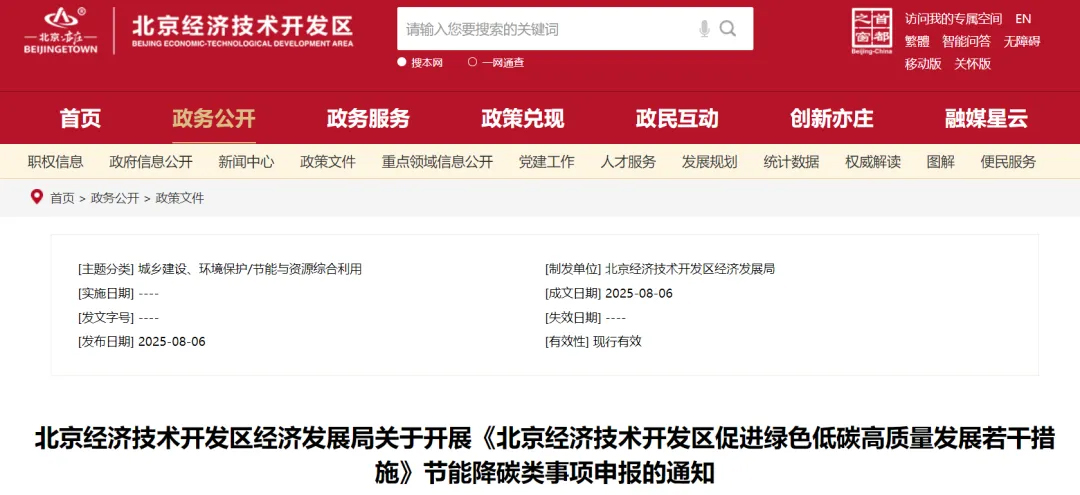 8月6日,北京经济技术开发区经济发展局发布通知,开展节能降碳类事项申报,并给予资金奖励。具体包括分布式光伏发电、新能源供热、绿电交易、节能减碳服务、碳中和认证。此次申报采用线上注册、申报的形式,申报时间为2025年8月7日至2025年9月30日。其中,未获得节能审查意见的数据中心项目、使用政府财政资金投资建设的项目,未列入此次支持范围内。