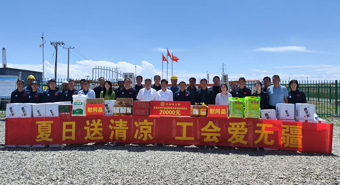 在基地大门前,蔡毅德主席亲手将饱含关怀的慰问金和慰问品一一送到职工手中,一句真挚的“大家辛苦了!”,让高原热浪化作汩汩暖流。蔡主席与青年科技骨干们面对面交流,勉励大家要以更高的站位、更广阔的视野、更坚毅的作风,锤炼打造新时代的 “地热铁军”,齐心协力将共和盆地建设成为在全球具有广泛影响力的深部地热科技创新高地。