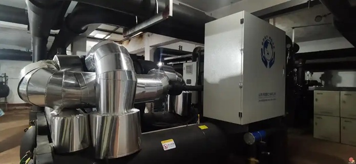 为解决传统热泵运行模式带来的高成本、高耗能及维修保养等问题,国内首台磁悬浮离心式地源热泵机组于6月中旬在潍坊市坊子区地质家园小区正式启动制冷服务。该机组于2024年11月15日投入使用,由《中国地热》两家编委企业山东省煤田地质局第四勘探队与山东天瑞重工有限公司共同自主研发。