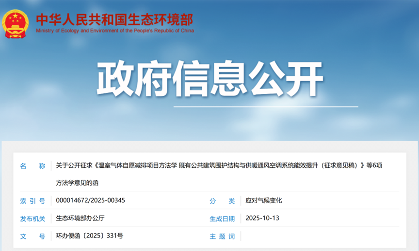 为进一步完善温室气体自愿减排项目方法学体系,鼓励更广泛的行业、企业开展温室气体减排行动,规范温室气体自愿减排项目设计、实施、审定和减排量核算、核查工作,根据《温室气体自愿减排交易管理办法(试行)》,生态环境部组织编制了《温室气体自愿减排项目方法学 既有公共建筑围护结构与供暖通风空调系统能效提升》《温室气体自愿减排项目方法学 农业废弃物集中处理工程》《温室气体自愿减排项目方法学 可再生能源电解水制氢》《温室气体自愿减排项目方法学 淤地坝碳汇》《温室气体自愿减排项目方法学 电气设备六氟化硫回收和净化》《温室气体自愿减排项目方法学 中深层地热能井下换热供暖》,现公开征求意见。征求意见稿及其编制说明可登录生态环境部网站(http://www.mee.gov.cn)“意见征集”栏目检索查阅。