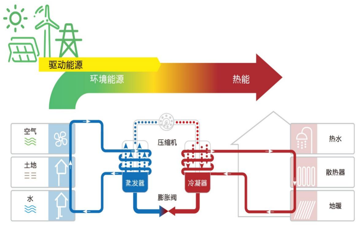 超低温CO₂空气源热泵技术:采用CO₂跨临界复合式循环系统,通过两种工质的压缩制冷循环,吸取空气中的热量用于供暖。通过对CO₂高温热能的梯级利用及涡流管技术,提高CO₂提取室外环境中空气热能的能力,该技术出水温度可以达到70℃,可在零下45℃环境温度下正常运行,成为北方“煤改电”清洁取暖的重要选择,为农村、城镇住宅提供稳定供暖。