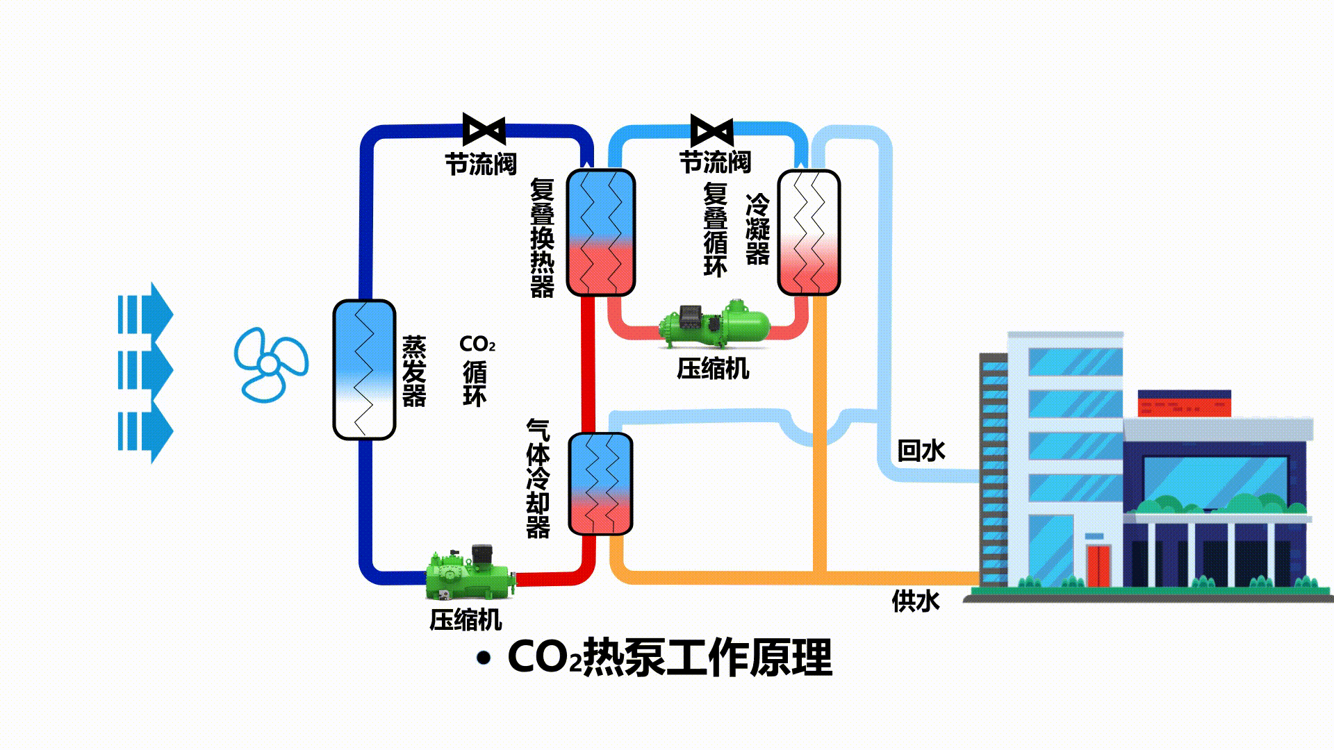 跨临界CO₂热泵技术:热泵压缩机把低温低压气态CO₂压缩成高压高温的气态,与水进行热交换,高压的CO₂在常温下被冷却、冷凝为液态,再经过蒸发器(空气热交换器)吸收空气中的热能,由液态CO₂变为气态CO₂,低温低压的气态CO₂再由压缩机吸入,压缩成高压高温气态CO₂。如此往复循环,不断地从空气中吸热,在水侧换热器放热,制取热水。适合用于酒店、医院、泳池等需要大量高温热水的场所。