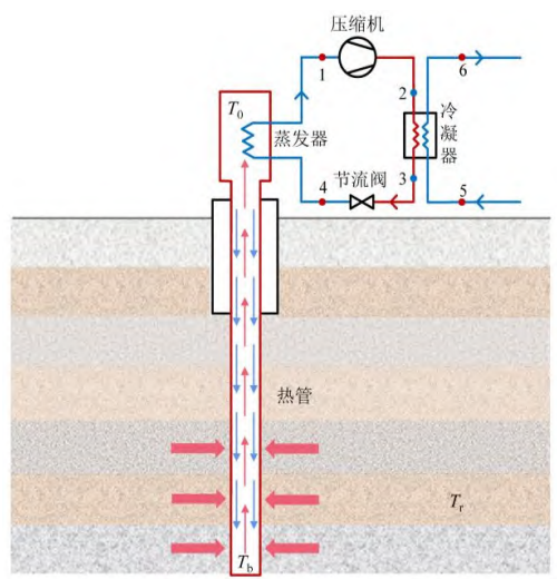 在地热井内安装全封闭的管体,通过管内工质的沸腾-凝结实现地热能由地下(沸腾吸热)到地面(凝结释热)的长距离传输。重力热管靠近地下一端为蒸发段,靠近地面一端为冷凝段。在蒸发段受热时,液体状的工质吸收热量气化成蒸汽,蒸汽流向地面端,在冷凝器内由于受到冷却使蒸汽释放汽化潜热凝结成液体,液体在重力的作用下,回流到蒸发端并再次气化,以此循环提取利用地热能。单根热管传热能力为3兆瓦,适用于地热资源丰富但水资源匮乏或地质条件敏感的地区。因其低运行功耗的特点,在偏远地区供热、工业余热提取等领域也具有较大应用潜力。