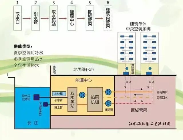 其工作原理是:用电驱动热泵机组,冬季从江水中提取热量,为建筑供暖;夏季则将建筑内的热量“取”出,释放到温度相对较低的江水中,从而实现制冷。整个过程只交换能量,不消耗水资源,也不改变水质。江水在完成能量交换后,经管道退水,甚至还有助于提升内河水质。