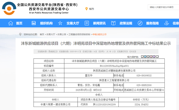 据了解,中建六局在地热能开发利用领域已有系列布局。此前,旗下第一建设有限公司曾中标西咸新区地热供暖施工项目。2025年9月,中建六局第一建设有限公司与陕西西咸新区沣沣慧新能源发展有限公司签署“沣东新城能源供应项目(六期)沣沣明苑”地热工程施工合同,合同金额约2224.35万元。该项目主要建设内容包括中深层地热地埋管及供热管网施工。