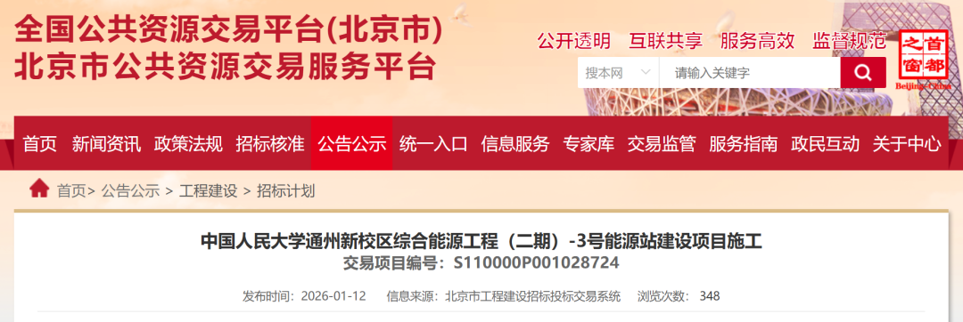 招标范围: 中国人民大学通州新校区综合能源工程(二期)-3号能源站施工。要求施工单位按照要求完成能源工程施工安装相关工作,招标范围为图纸所示全部内容,主要包括但不限于3号能源站内的工艺设备及配套系统的采购、安装及调试,地埋管系统施工及调试,与校区已建成系统的连接、调试、软件数据对接等全部内容。