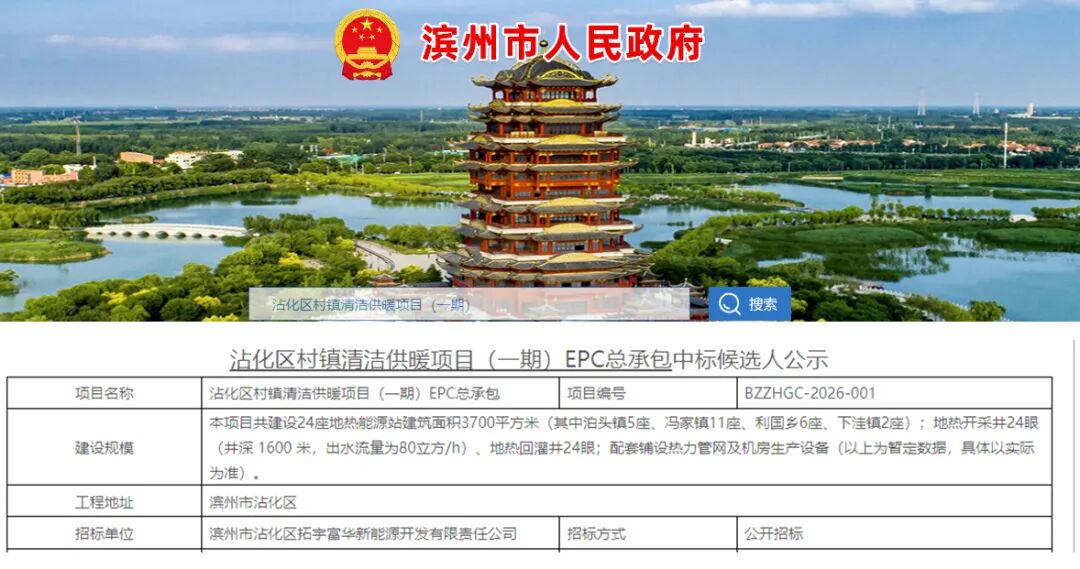 近日,山东省滨州市沾化区村镇清洁供暖项目(一期)EPC总承包中标结果正式公示。该项目中标金额为309880800元,由山东永建顺建筑工程有限公司作为联合体牵头人,联合山东省地质矿产勘查开发局第二水文地质工程地质大队(山东省鲁北地质工程勘察院)及山东事为工程设计有限公司共同中标。