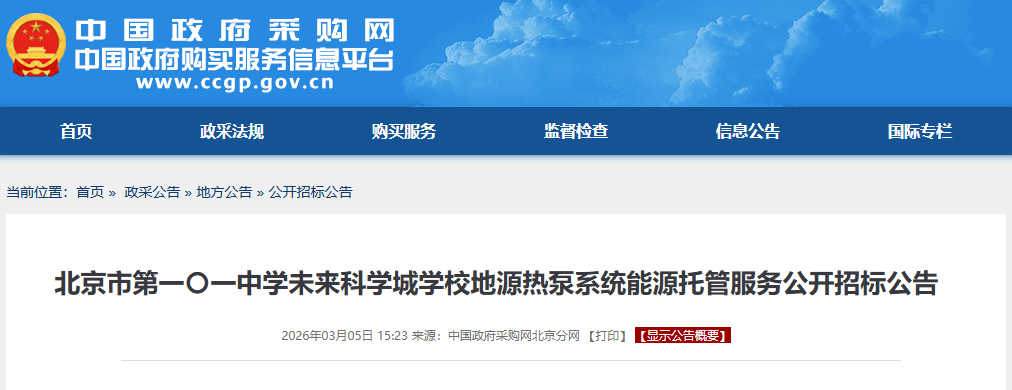 3月5日,中国政府采购网发布了“北京市第一〇一中学未来科学城学校地源热泵系统能源托管服务公开招标公告”。本次招标的服务内容为对地源热泵系统进行运行维修保养,预算金额为493.5762万元。