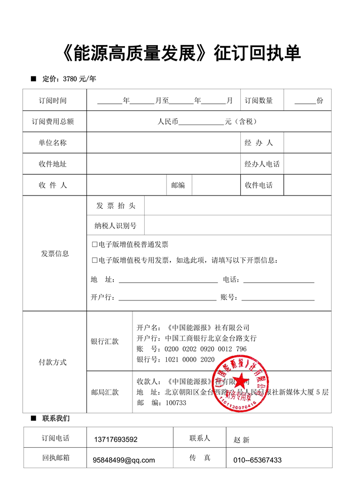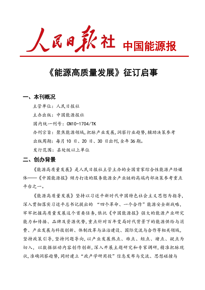 核心提示:人民日报社中国能源报《能源高质量发展》开始征订!