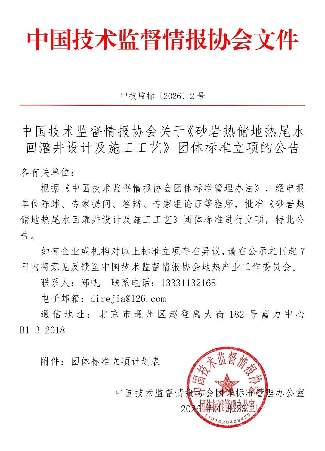 4月23日,中国技术监督情报协会团体标准管理办公室正式批准《砂岩热储地热尾水回灌井设计及施工工艺》团体标准立项,该标准由中国技术监督情报协会地热产业工作委员会发起申请,旨在为地热资源可持续开发利用提供关键技术支撑。