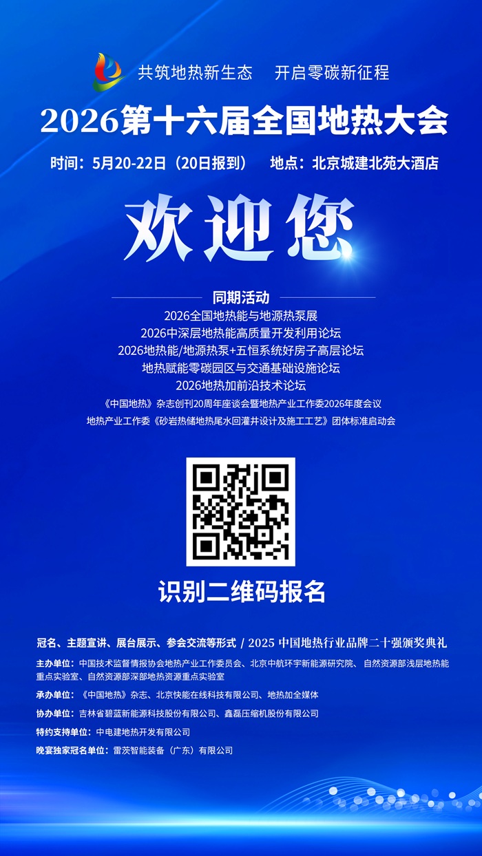 “2026第十六届全国地热大会暨全国地热能与地源热泵室内展览会”是中国地热产业连续举办时间最长的专业大会及展览活动,由中国技术监督情报协会地热产业工作委员会、北京中航环宇新能源研究院、自然资源部浅层地热能重点实验室、自然资源部深部地热资源重点实验室共同主办。